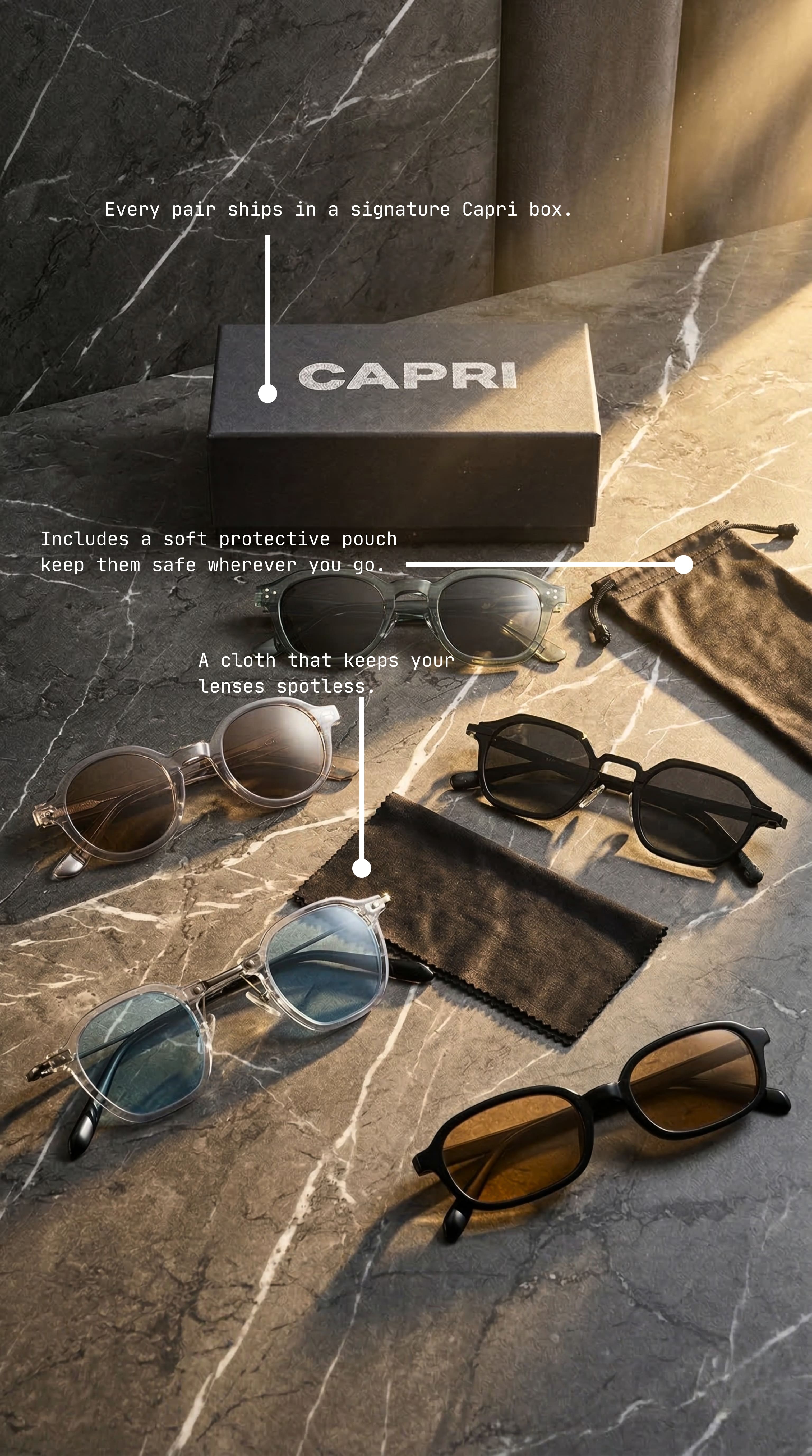 CAPRI arrives in a sleek branded box with a soft drawstring pouch and microfiber cloth designed to keep your frames protected, clean, and ready to wear wherever your day goes.